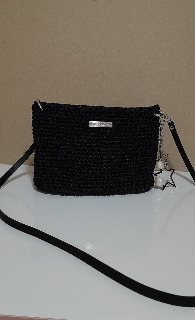Siyah örgü kadın çanta, minimalist tasarıma sahip, çıkarılabilir askı ve yıldız şeklinde süslemeler içerir. Günlük kullanım için uygundur.