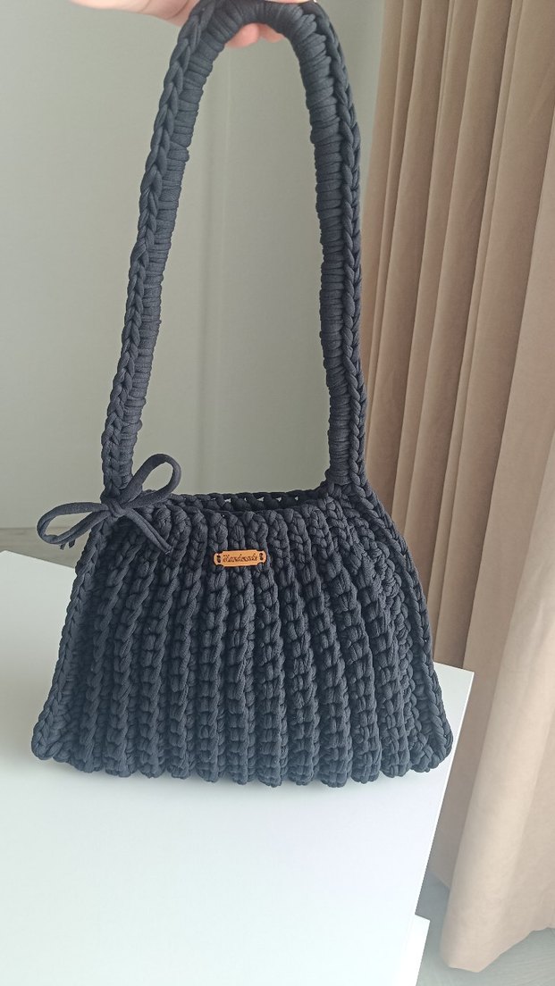 Siyah örgü kadın çanta, dokulu örgü deseni ve küçük fiyonk detayıyla sade ve rahat bir tasarıma sahiptir.