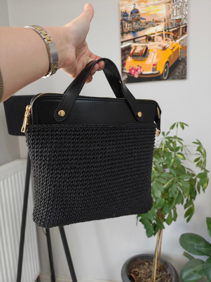 Siyah örgü, fermuarlı ve kısa saplı minimalist ve çağdaş tarzda kadın çantası.