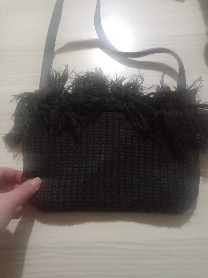 örgü, püsküllü detaylı kadın çantası. Rahat ve retro gotik tarzı günlük kullanıma uygun.