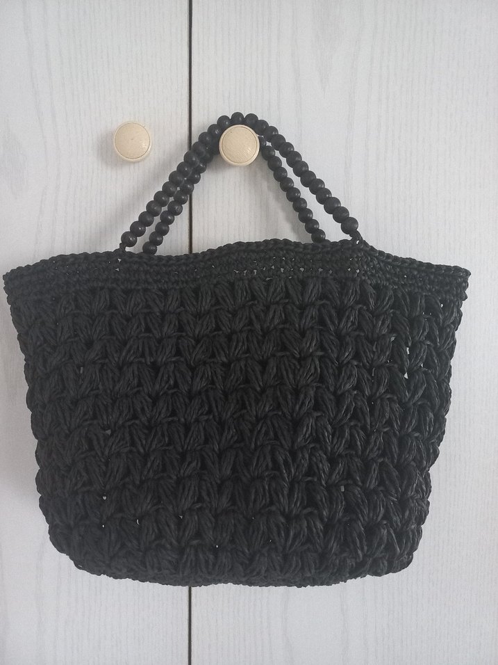 Siyah örgü kadın çanta, boncuklu sapları ve fıstık modelli örgü deseniyle bohem tarzı yansıtıyor, günlük kullanım için uygun. boyu 19 cm eni 31 cm kendi el örgümdür. @tutku_hobby marka temsilidir
