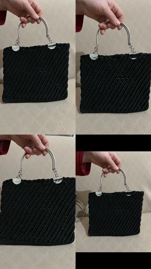 Günlük kullanıma uygun, metal saplı siyah örgü kadın çanta. Desensiz dokusu sade ve gotik esintili bir tarz sunar. El yapımıdır. İlgilenenler mesaj atabilirler :)