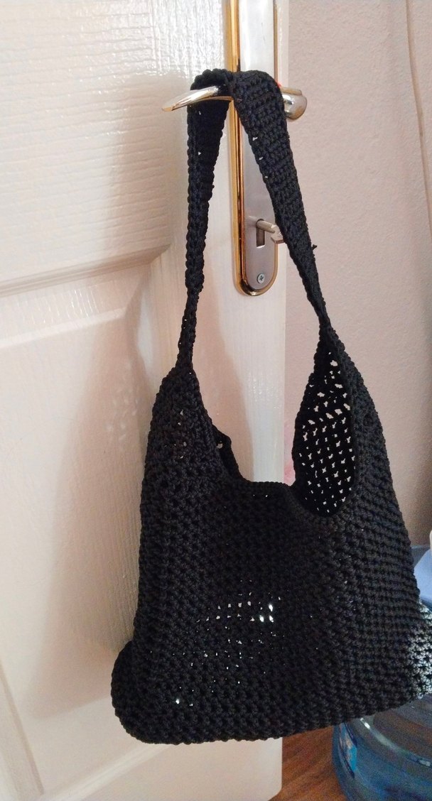 Siyah renkli, makrome ip ile örülmüş fileli çanta