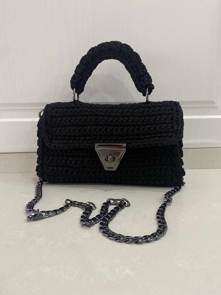 Siyah örgü dokusuna sahip kadın çanta, sağlam sapı ve metal zincir askısıyla sade ve rahat gotik stil sunar. Üçgen metal tokası bulunur.
