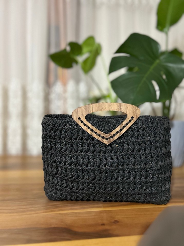 Siyah örgü dokusuyla ve ahşap sapıyla minimalist bohem tarzda günlük kullanıma uygun kadın çanta. Astarsızdır astar diktirebilirsiniz kişiye özel istenilen model de yapılır