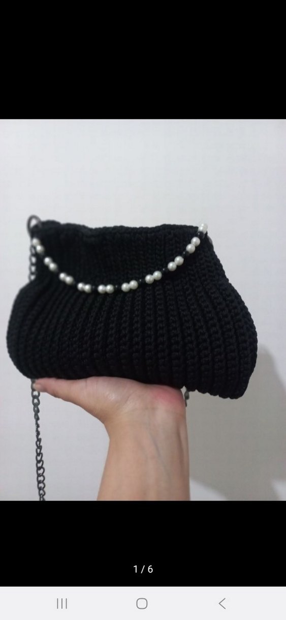 Siyah örgü kadın çanta, rahat dokusu ve inci zincir detayıyla gotik tarzı günlük kullanıma taşıyor.