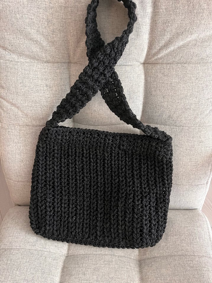 Bu siyah örgü kadın çantası, kalın askılı, desensiz sade tasarıma sahiptir ve minimalist goth tarzıyla günlük kullanıma uygundur.