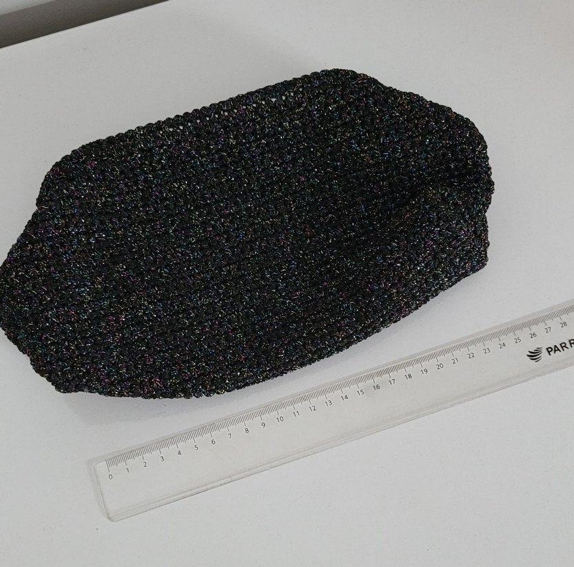 Siyah renkli, örgü dokulu kadın clutch çanta. Avangart ve karşı kültür tarzına uygun, dış mekan kullanımı için ideal bir aksesuardır.