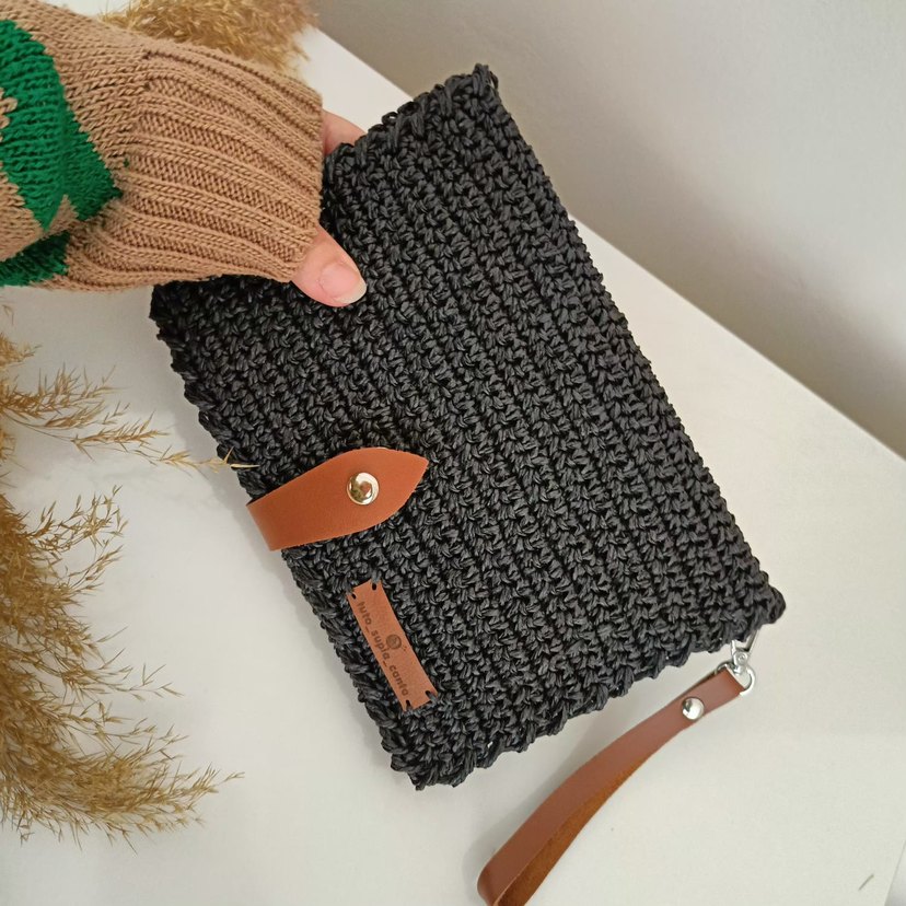 Siyah örgü tasarıma sahip kadın clutch çanta, kahverengi deri kayış ve çıtçıt kapamalı, günlük kullanım için rahat ve bohem tarzda.Aynı zamanda cüzdan kısmıylada farklılık yaratmaktır.
