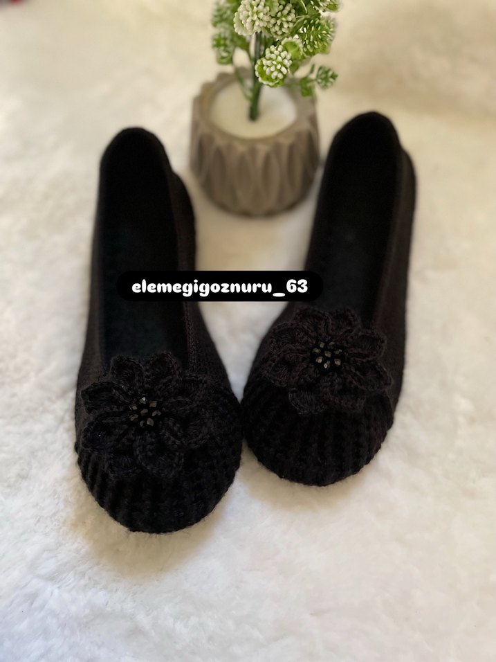 Siyah örgü kadın terlikler, dolgu topuklu ve işlemeli çiçek detaylıdır. Rahat ve günlük kullanım için uygundur.
