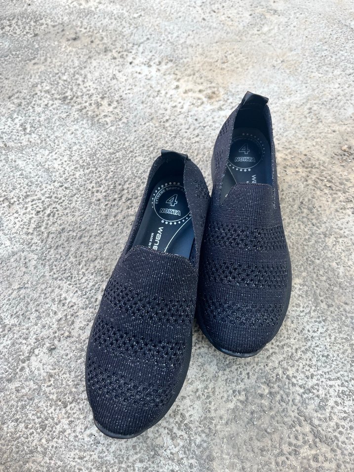 Siyah örgü üst yüzeye ve dolgu topuklara sahip kadın spor ayakkabısı, günlük kullanıma uygun rahat ve trend bir modeldir.
