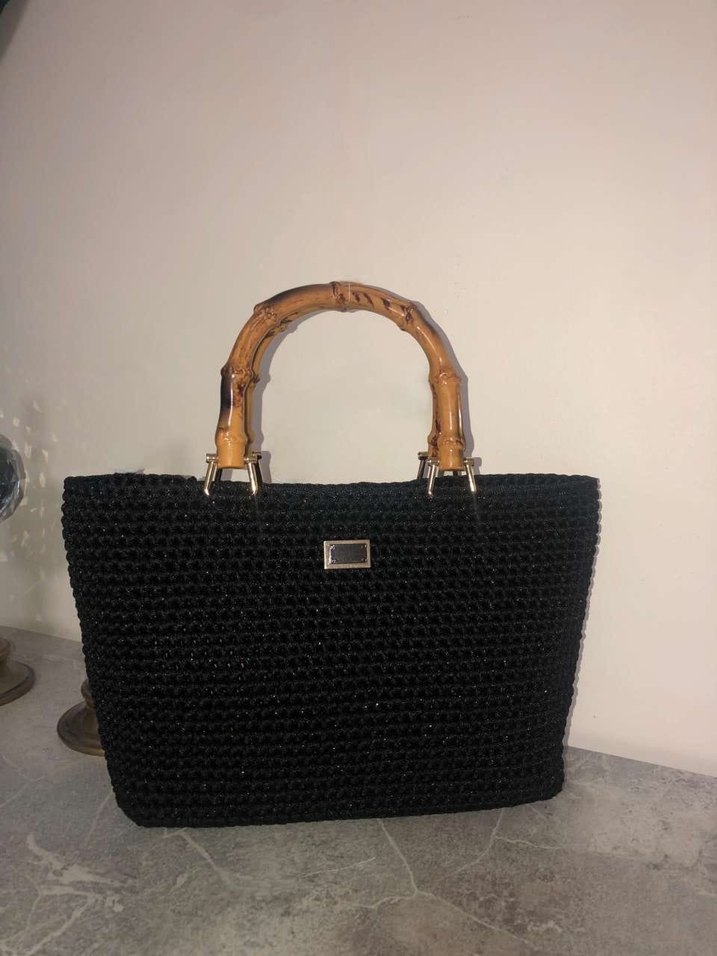 Bambu saplı siyah örgü kadın el çantası, minimalist ve bohem tarzıyla günlük kullanıma uygun.