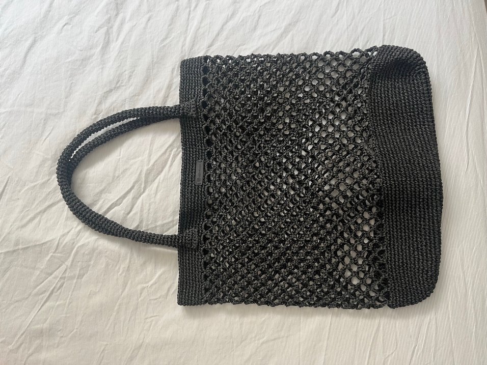 Siyah örgü kadın el çantası, minimal ve bohem tarzda, yumuşak örgü dokusuyla günlük kullanıma uygundur. Desensiz tasarım.