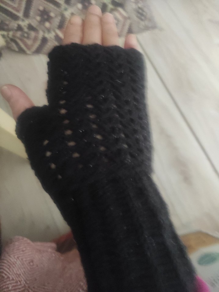 Siyah örgü kadın eldivenler, açık parmak tasarımıyla rahat ve gotik bir tarz sunar. Karanlık ve vintage bir dokunuş için idealdir.