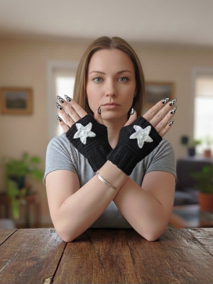 GÖRSEL BANA AİTTİR İLAN AÇIYORUM yıldız detaylı siyah örgü kadın eldivenleri, rahat örgü yapısıyla rock punk tarzını yansıtıyor. Parmaksız tasarım.