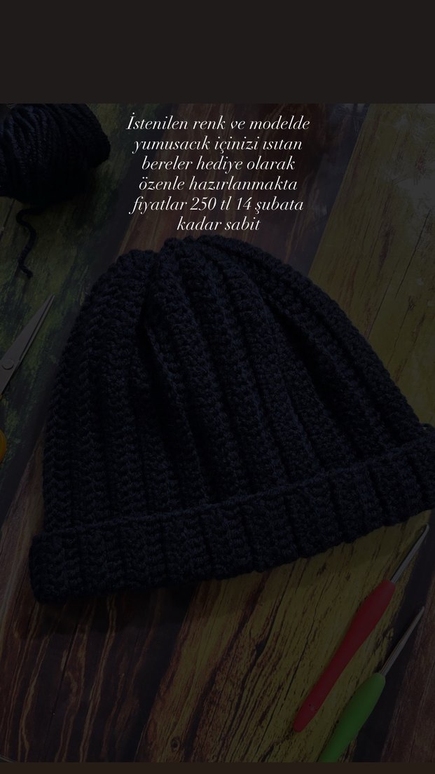 Yumuşak ve sıcak tutan siyah örgü kadın bere. İstenilen renk ve modelde, hediye olarak özenle hazırlanmıştır. Fiyatlar 14 Şubat'a kadar 250 TL sabittir.