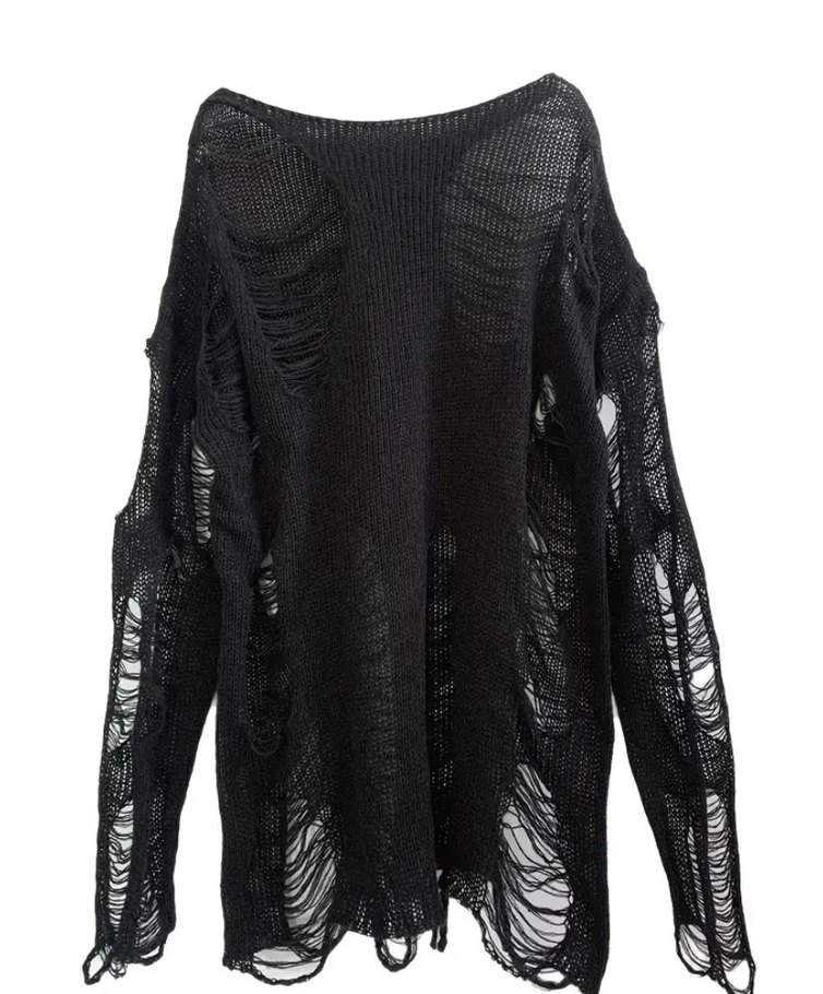Bol kesim siyah örgü kadın kazak, uzun kollu ve yuvarlak yaka. Yırtık detaylarıyla gotik tarzda, günlük kullanıma uygun. Hiç kullanmadım. (BEYAZ OLAN MANKEN ÜZERİNDEKİ DURUSUNU GÖSTERMEK İÇİN EKLEDİM )