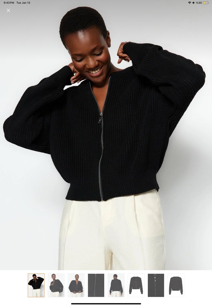 Siyah örgü hırka, uzun kollu. Bol kesimi ve fermuarlı önüyle günlük rahatlık sunar. Midi boyda, sokak stiline uygun bir parça.