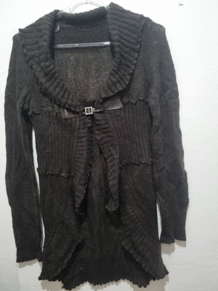Siyah örgü kadın hırka, notched yaka, uzun kollu ve vücuda oturan kesime sahiptir. Midi boyda, goth tarzı ve dekoratif tokalı kapama detaylıdır.