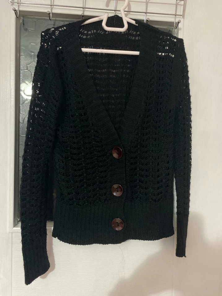 Siyah örme kadın hırka, uzun kollu ve notalı yakalıdır. Rahat kesimiyle gündelik kullanıma uygundur. sorunsuz standart beden