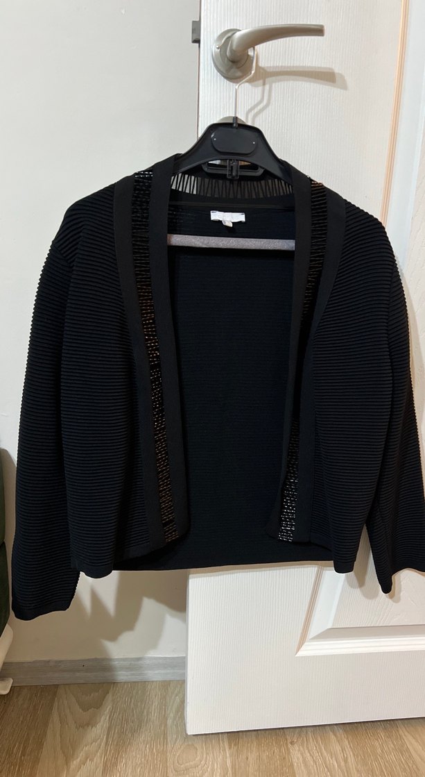 Siyah örgü, yakalı ve uzun kollu, ofis için uygun, normal midi boyda, sade ve şık kadın hırkası.