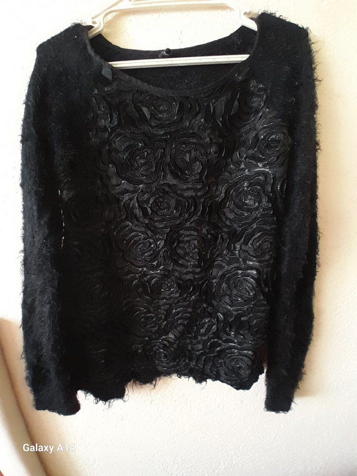 Uzun kollu, yuvarlak yakalı siyah örgü kadın kazak. Gevşek kesim ve dokulu çiçek deseniyle gotik tarzı tamamlar.