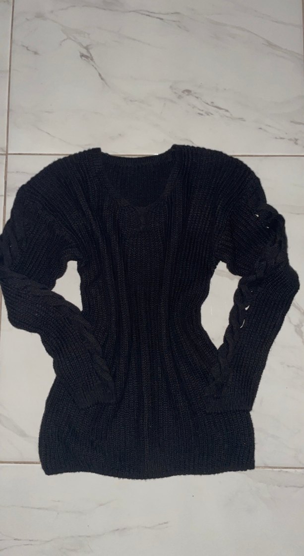 Bu siyah, örgü, ince kesim kadın kazak uzun kollu ve yuvarlak yakalıdır. Günlük kullanıma uygun rahat ve gotik tarzda bir parçadır.