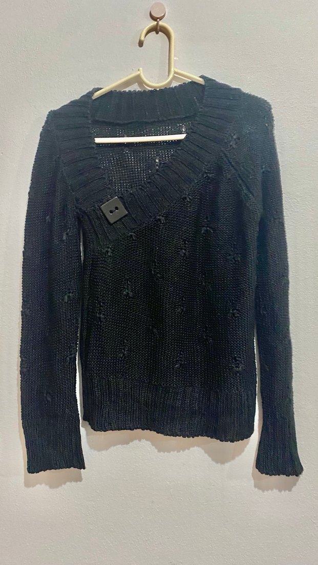 Siyah örgü kadın kazak, yandan yaka detaylı ve uzun kolludur. Rahat kesimi ve sıcak goth tarzıyla gündelik kullanıma uygundur.