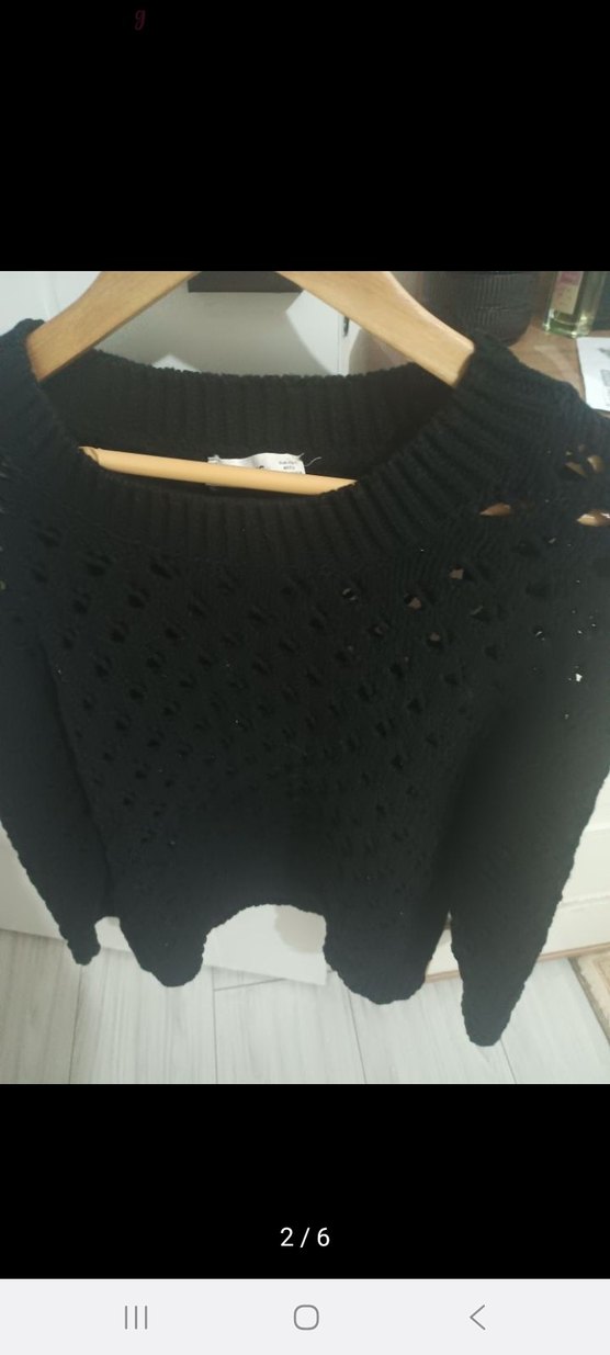 Siyah örgü kumaştan, yuvarlak yaka ve uzun kollu, bol kesim kadın kazak. Rahat ve şık, günlük kullanım için uygundur. L beden