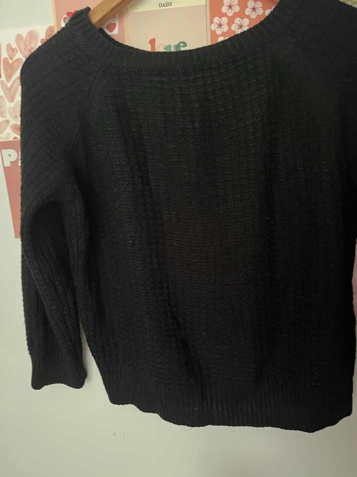 Siyah renkli, örgü kumaştan yapılmış, yuvarlak yaka ve uzun kollu kadın kazak. Salaş kesimi ve normal boyu ile günlük rahat sokak stili için uygundur.