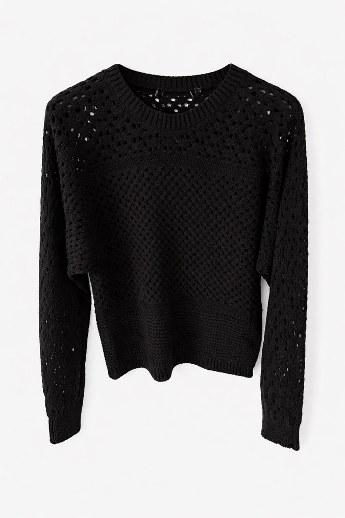 Siyah örgü kadın kazağı, uzun kollu ve yuvarlak yaka detaylarıyla rahat ve gotik tarzda günlük kullanıma uygundur.