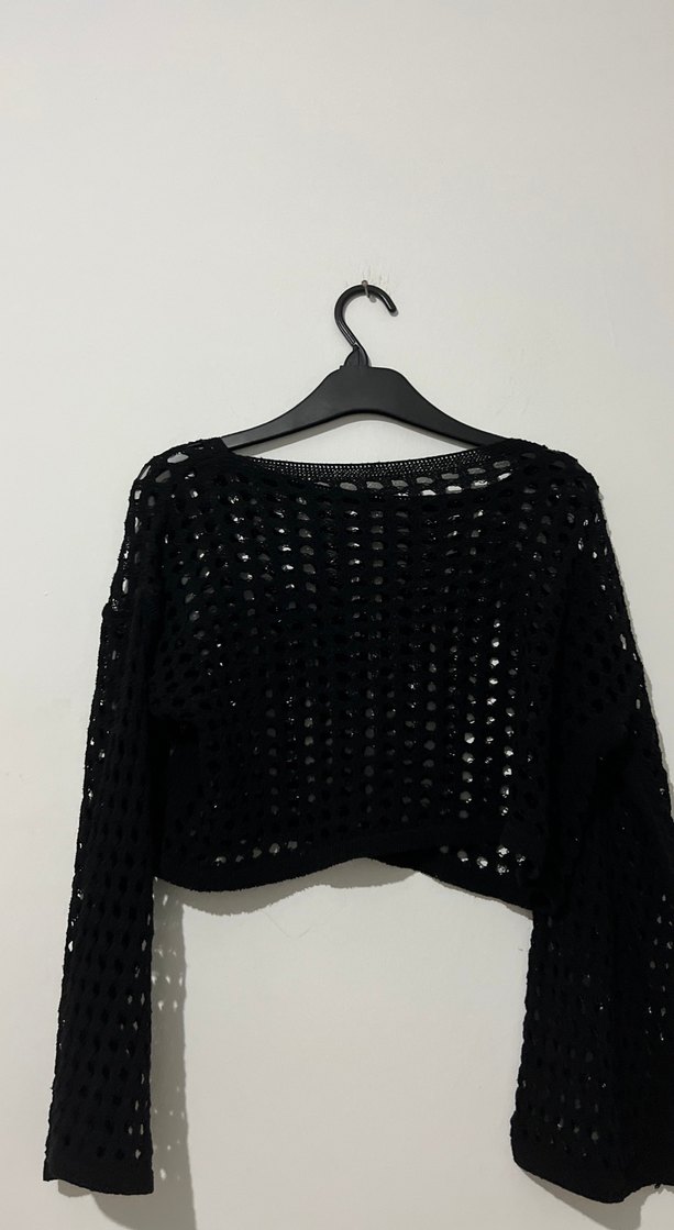 Siyah örgü kadın kazağı, uzun kollu ve kayık yaka detaylıdır. Bol kesim ve midi boyuyla minimalist gotik tarz sunar.