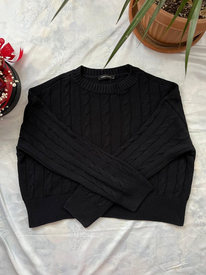 Siyah renkli, uzun kollu, yuvarlak yaka, örgü dokulu, bol kesim kadın kazak. Rahat ve goth tarzında, günlük kullanım için uygundur.