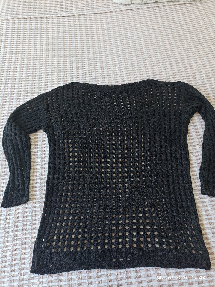 Siyah örgü kadın kazağı, yuvarlak yaka ve uzun kolludur. Bol kesim ve normal midi uzunluğundadır, günlük kullanıma uygundur. Açık örgü deseniyle rahat ve gotik bir tarz sunar.