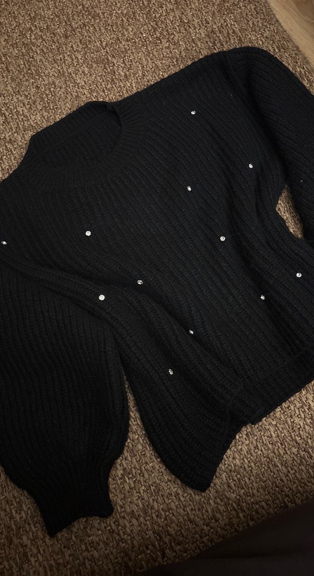 Siyah örgü kadın kazak, yuvarlak yaka ve uzun kolludur. Boncuk detaylarıyla rahat ve şık bir goth tarzı sunar.