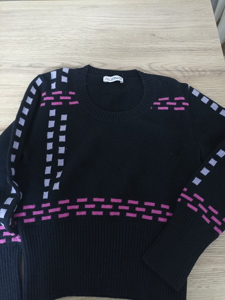 Siyah örgü kadın kazak, yuvarlak yaka ve uzun kollu. Dar kesim, mor detaylarla gotik tarzda günlük kullanıma uygun.