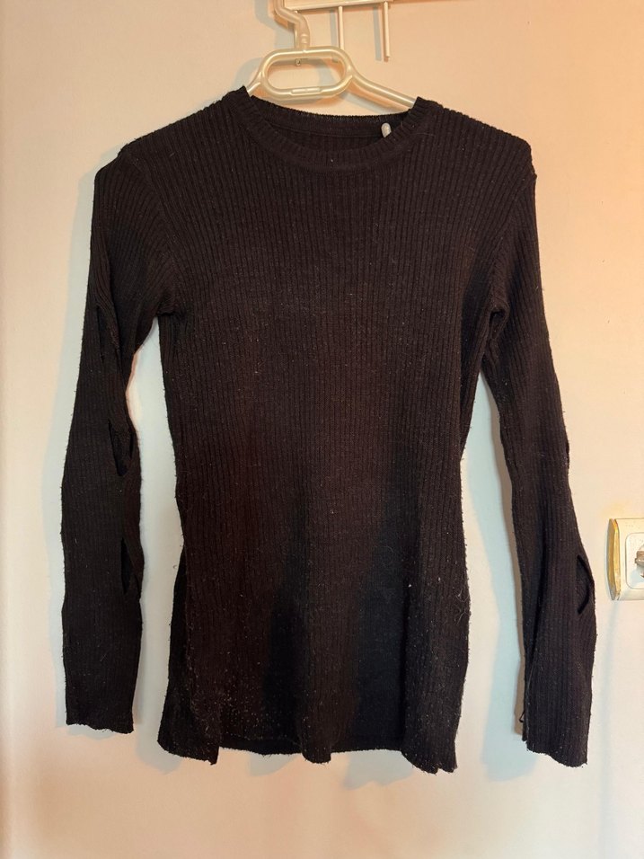 Siyah örgü kadın kazak, uzun kollu ve yuvarlak yaka. Dar kesimi ve midi boyuyla günlük kullanıma uygun, rahat goth tarzı.