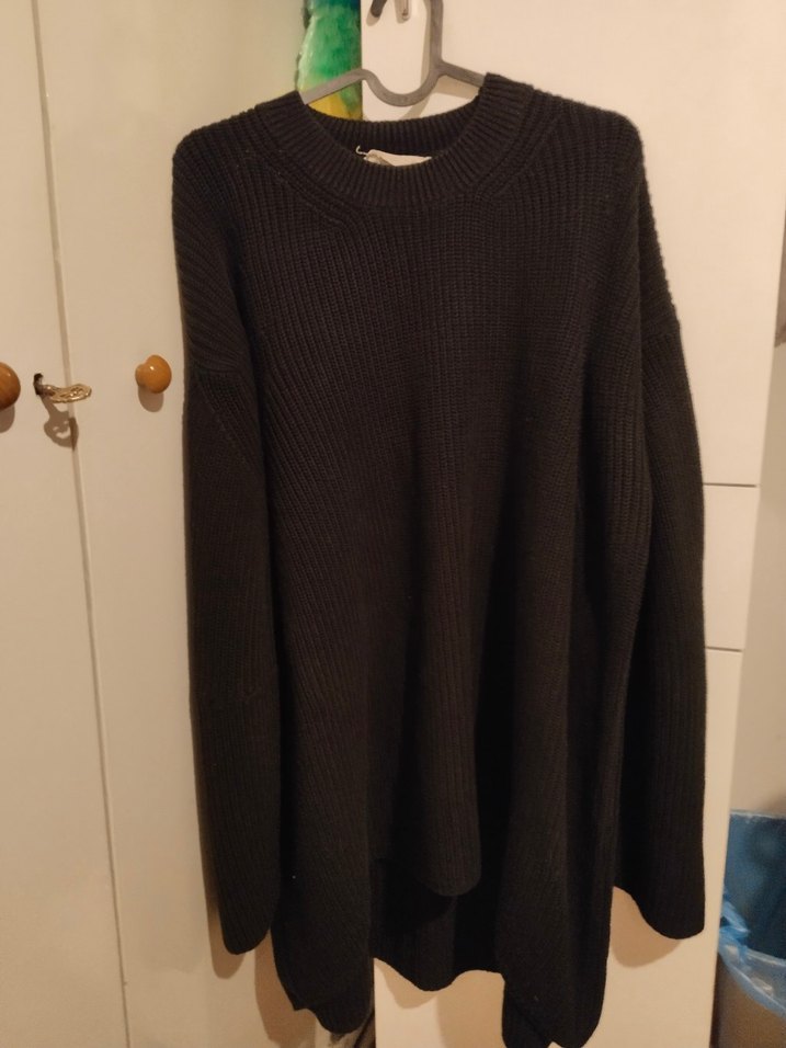 Siyah renk, yün kumaştan örülmüş, uzun kollu, salaş kesim ve yuvarlak yakalı midi uzunlukta kadın kazak. Rahat ve sade tarzda, günlük kullanıma uygundur.