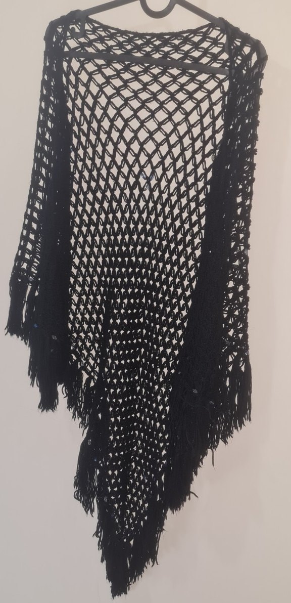 Siyah örgü kadın panço, açık örgü deseni ve püsküllü kenarlarıyla gotik ve bohem tarzı rahatlıkla birleştirir.