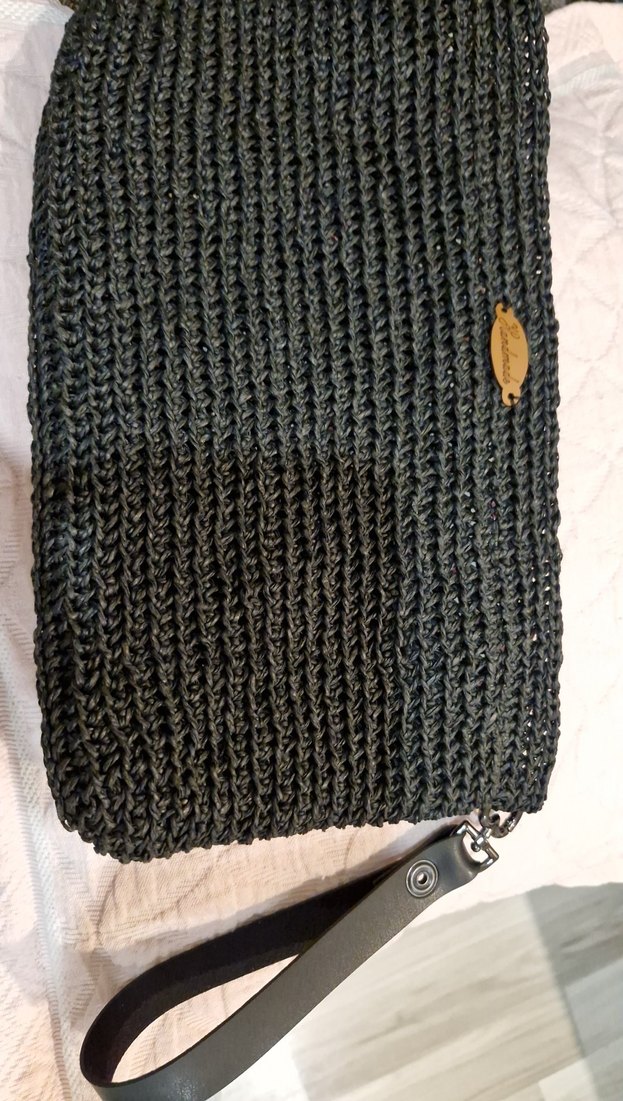 Siyah örgü kadın portföy çanta, sade ve desen içermeyen bohem tarzıyla, bilek kayışıyla kolay taşınır.
