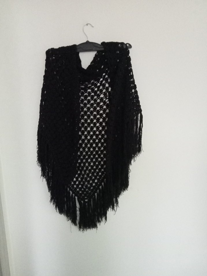 Siyah örgü, gotik tarzda kadın panço. Bohem ve retro havasıyla, püsküllü kenarlarıyla dikkat çeker. boy 105 cm eni 160 cm örgü şal sorunsuz dur