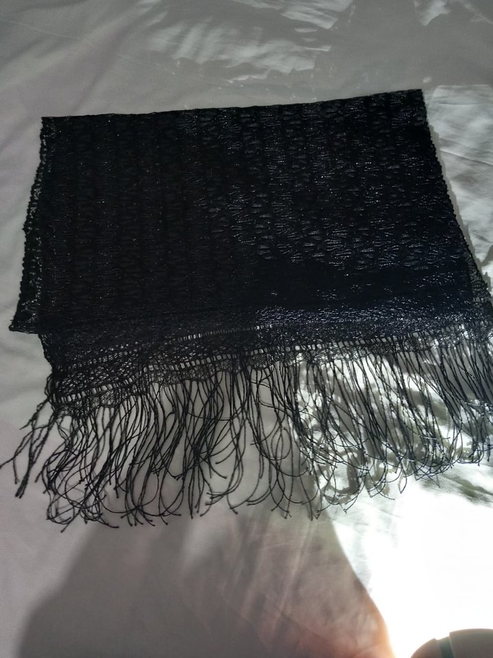 Püsküllü siyah örgü kadın şal, gotik tarz ve koyu tonlara sahip. Moda ve avangart bir görünüm için uygundur.