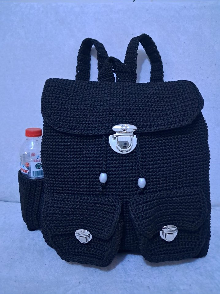 Siyah örgüden yapılmış, sade gotik tarzda rahat kadın sırt çantası. Çoklu cepler ve güvenli tokasıyla günlük kullanım için uygun.