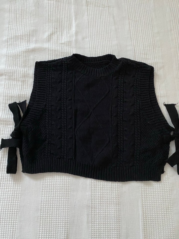 Bu siyah örgü, yan bağcık detaylı, kruvaze yaka, dar kesim kadın süveter, rahat ve avant-garde gotik tarz sunar.