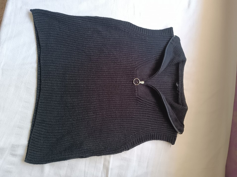 Siyah renkli, kolsuz, örgü dokulu ve fermuarlı, günlük kullanıma uygun, kadın süveter.