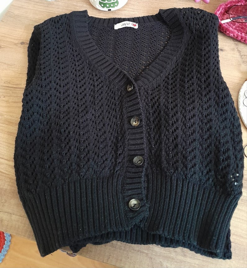 Siyah örme, düğmeli, yuvarlak yakalı, rahat kesim ve kolsuz kadın süveter. Günlük kullanım için uygundur.