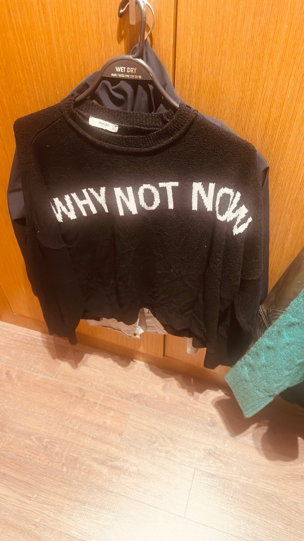 Siyah örgü kadın sweatshirt, uzun kollu, bol kesim ve bisiklet yaka. "WHY NOT NOW" baskılı, yün kumaştan midi boyda, günlük rahat kullanım için uygun.