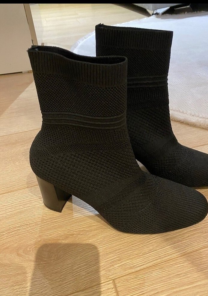 Siyah örgü üst kısmı ve kauçuk malzemesiyle blok topuklu kadın botları, günlük kullanıma uygun modern ve rahat bir tasarıma sahiptir.