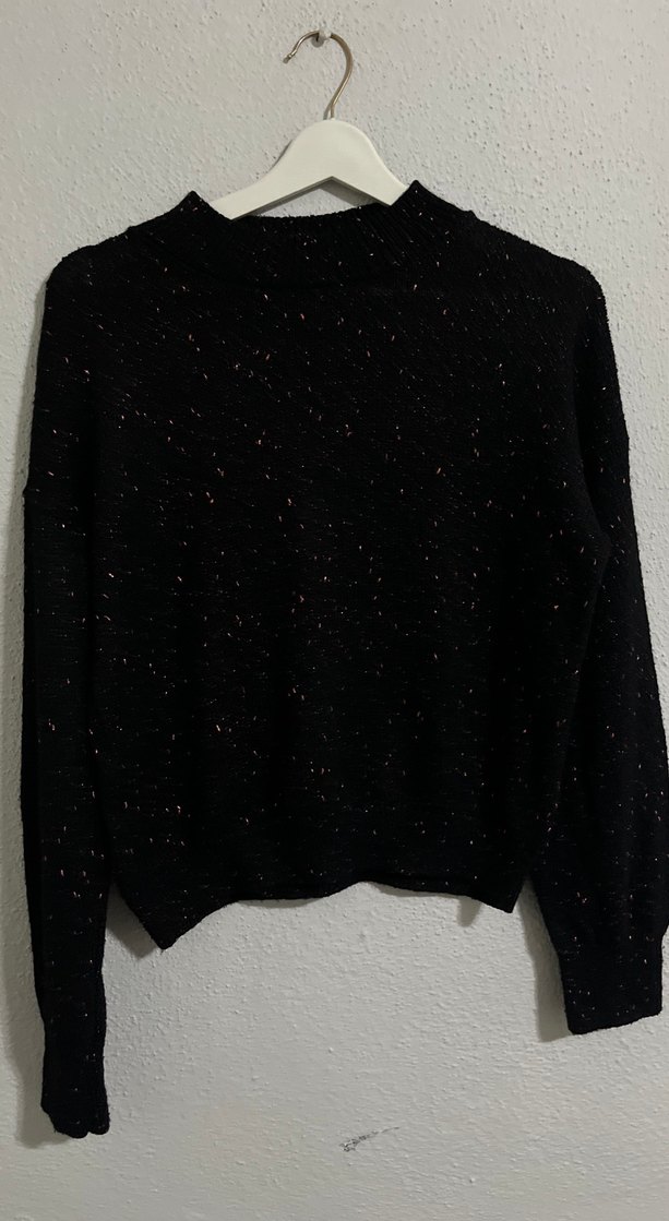 Siyah renkli, örgü kumaştan yapılmış, yuvarlak yakalı ve uzun kollu bol kesim kadın triko. Günlük rahat kullanıma uygundur.