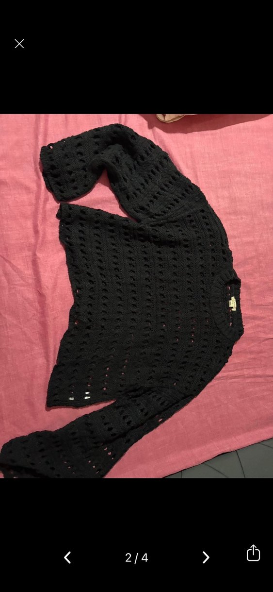 Siyah örgü triko bluz, uzun kollu ve salaş kesimlidir. Midi boyu ve kayık yaka detayıyla günlük rahat goth stilini yansıtır.